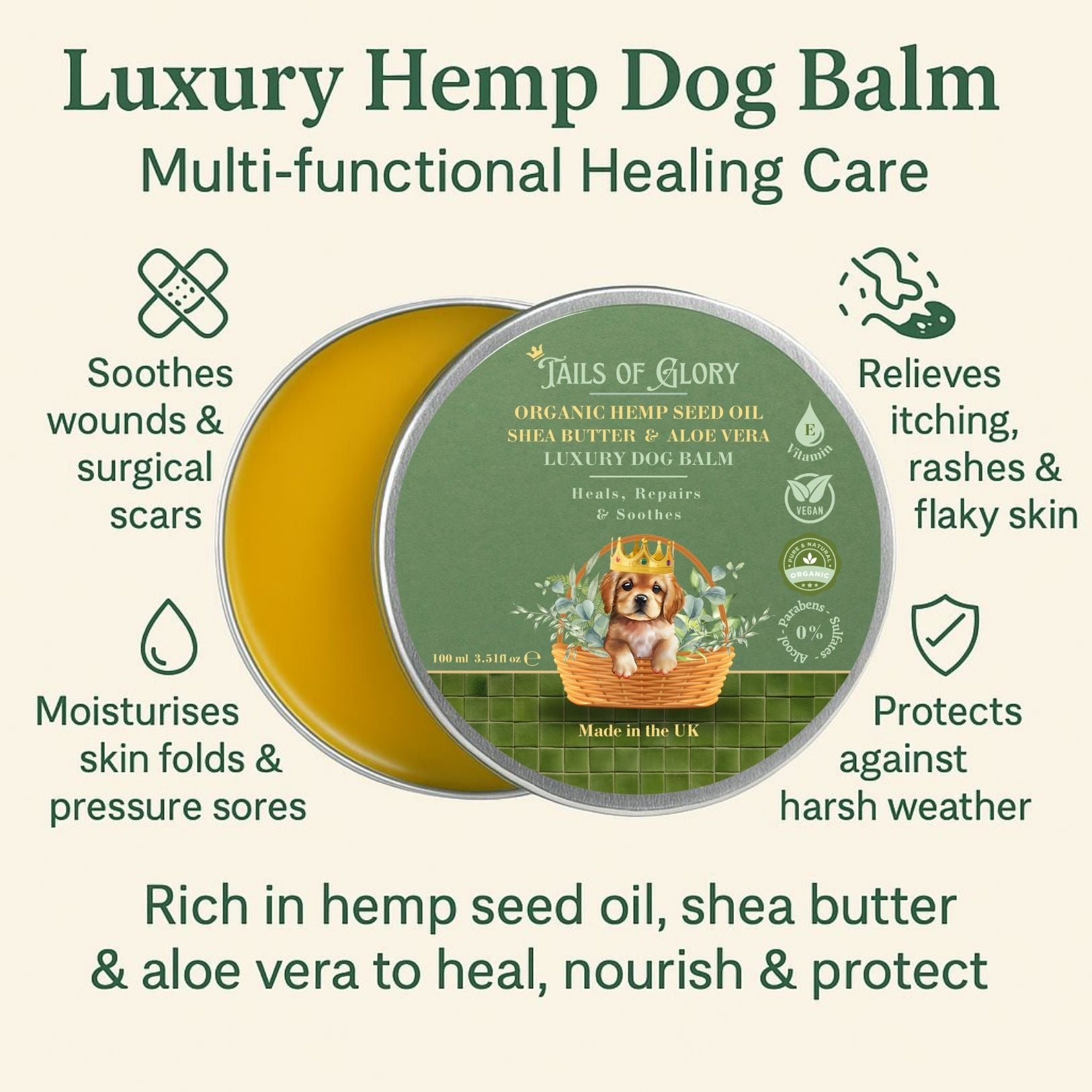 🐾From Our Family to Yours – At Tails of Glory, we’re a small family business on a mission to lead the Clean Grooming Revolution. All our grooming products for dogs are lovingly crafted here in Britain with safe, natural and organic ingredients—because pets deserve the same care and quality we’d want for our own family.Specially formulated to soothe and restore dry, cracked paws and noses in dogs and cats. Provides long-lasting hydration while helping maintain soft, healthy skin.